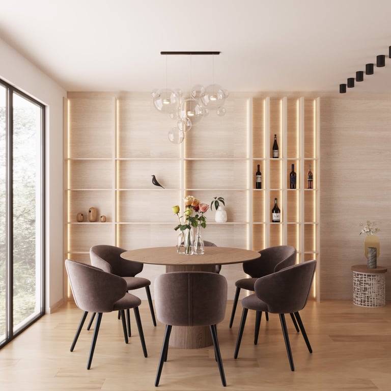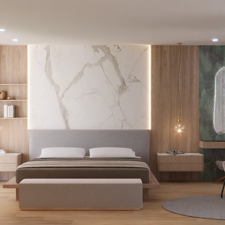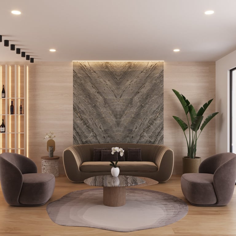 Un equilibrio de texturas nobles, mármol y mobiliario de formas suaves en un entorno residencial. Expresión de un diseño interior cálido, sofisticado y con identidad propia.